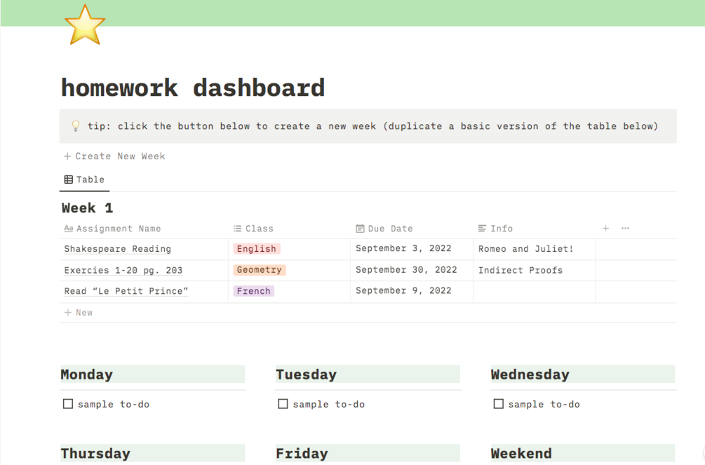 notion template for middle, highschool, or college students to stay organized with assignments. check out other templates on my page for other school-themed templates! more than just pictured is included in the template so please purchase to see the rest :)